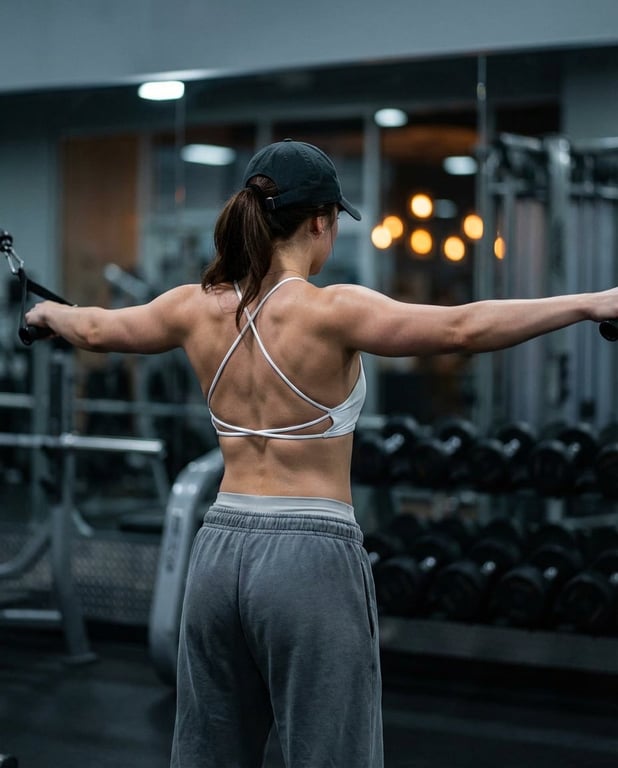 A highly detailed JSON prompt for Nano Banana Pro to generate a realistic cinematic photo of a female rock climber in a gym, seen from behind while holding cable handles. The prompt meticulously specifies the subject's physique (lean athletic, defined upper-back muscles), clothing details (ultra-thin string-strap sports bra forming an X-shape), low-key lighting, and photography style (shallow depth of field, cool highlights on muscles).