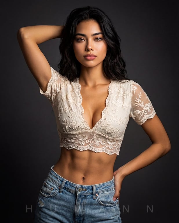 A detailed prompt for generating an ultra-realistic studio portrait of a woman, requiring 100% accuracy to an uploaded reference image (THE_SUBJECT). It specifies a confident pose (arm raised behind head, hand on hip), attire (off-white lace crop top, distressed denim jeans), and technical details (dark neutral studio background, soft cinematic lighting, 85mm lens, 8K resolution).