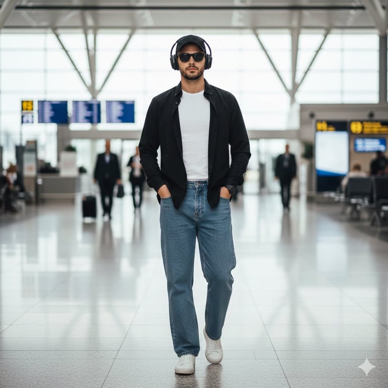 A prompt for generating an ultra-realistic image of a stylish young man walking naturally through a modern airport terminal, wearing casual high-fashion street style attire (white t-shirt, open black shirt, parallel-fit jeans, white sneakers), emphasizing soft cinematic lighting and motion blur in the background.