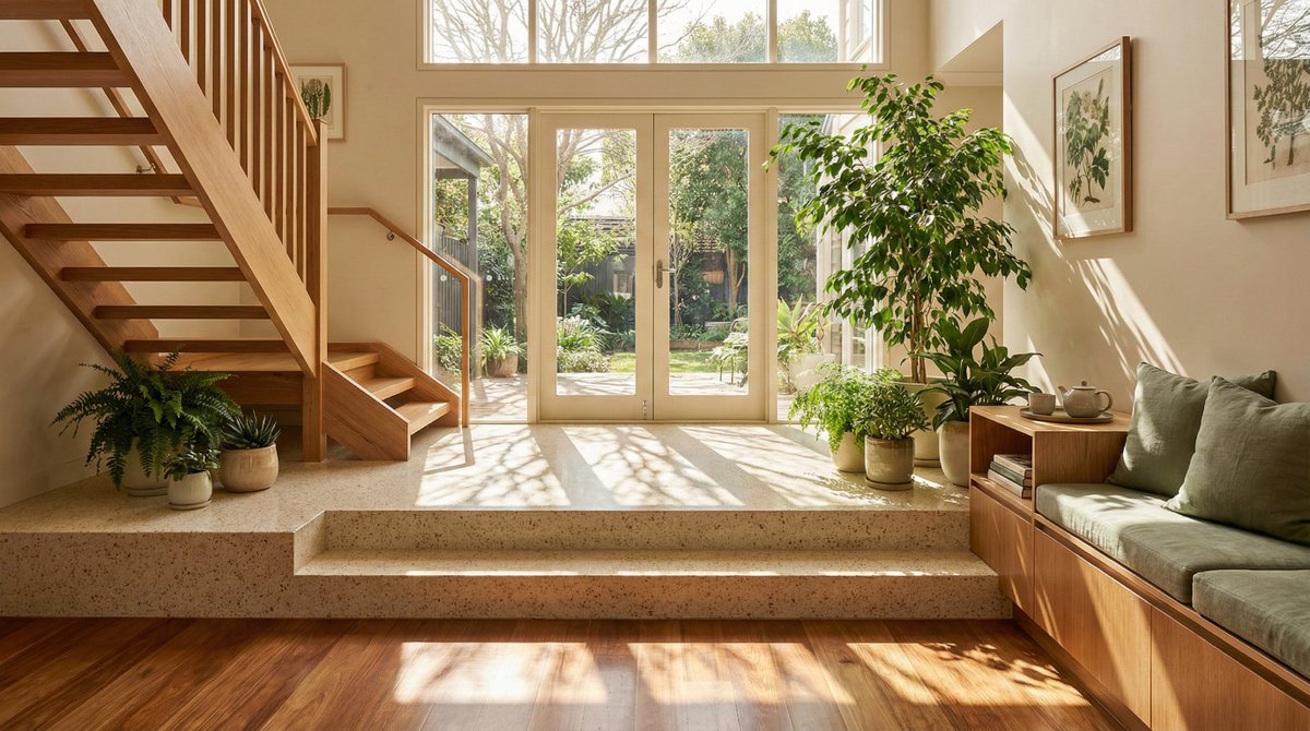 A highly structured JSON prompt for generating an architectural photograph of a modern, sun-drenched entryway. It specifies the split-level design, materials (wood, terrazzo), warm natural lighting creating dappled shadows, and a color palette of warm earth tones, aiming for a serene, high-end interior design showcase.