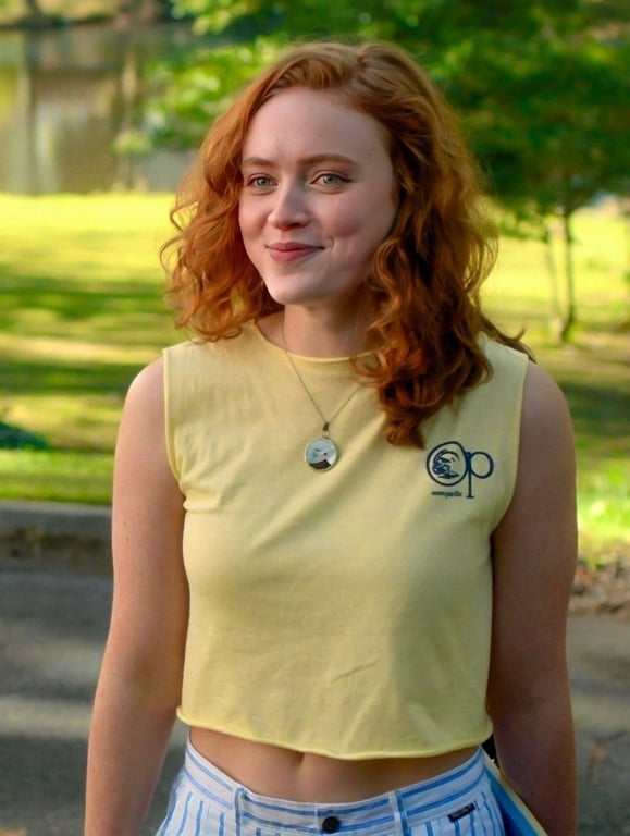 A JSON prompt for generating a cheerful portrait of a young woman (Sadie Sink lookalike) with curly red hair standing in a sunny park, wearing a light yellow crop top and striped pants, emphasizing a fresh, calm mood.