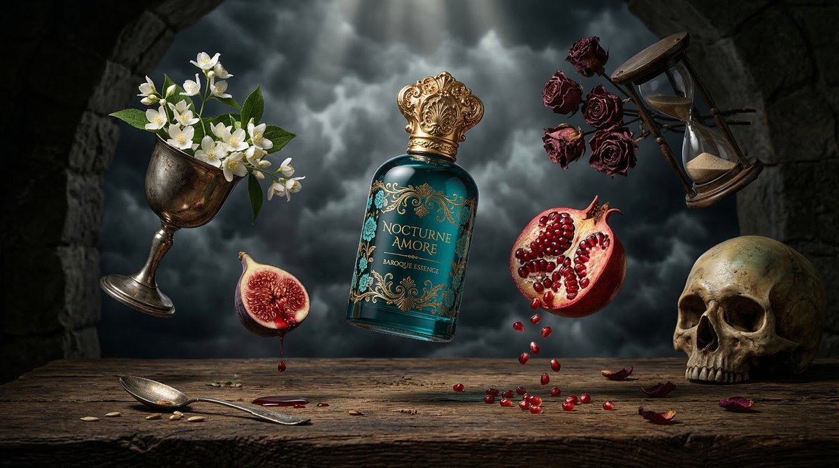 A detailed prompt for generating a surreal, high-end product advertisement image in a baroque style, featuring a perfume bottle, symbolic objects, Dutch golden age lighting, and hyper-realistic textures.
