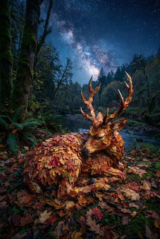 A prompt for generating an ultra-realistic, magical scene of a deer constructed entirely from autumn leaves, sleeping peacefully under a star-filled night sky with soft moonlight.