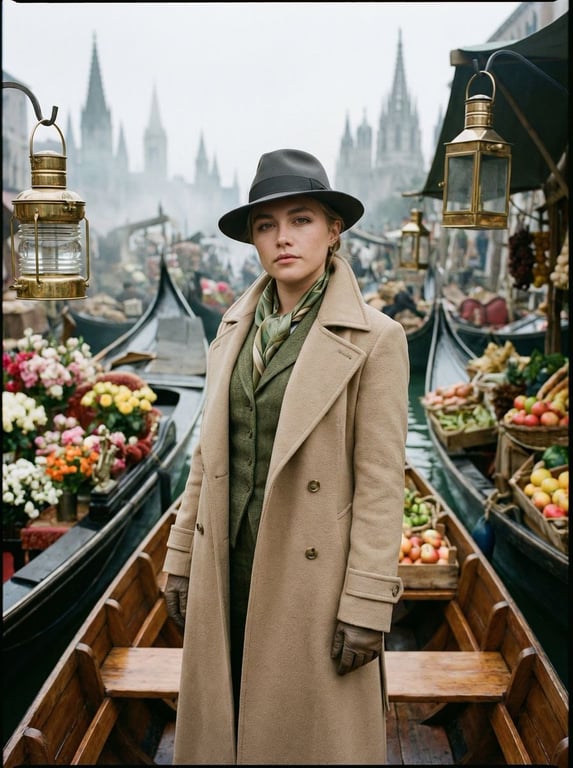 A complex, cinematic editorial prompt for generating a surreal scene: a protagonist standing on a gondola in a hyper-cluttered canal marketplace, surrounded by vibrant textures and mist-shrouded gothic spires. It specifies high-end medium format camera settings (Hasselblad H6D), Kodak Portra film emulation, and emphasizes texture and atmospheric depth.