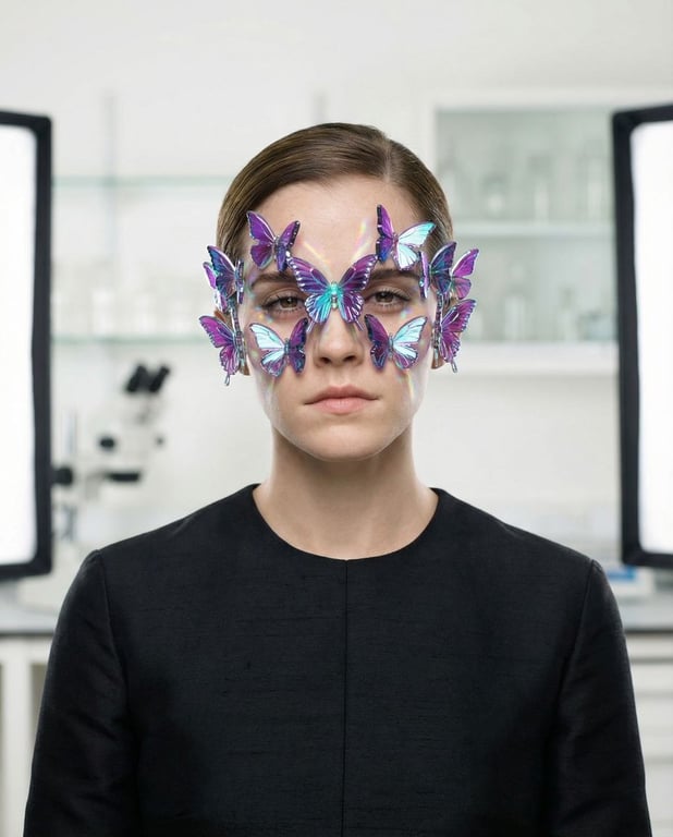 An extremely detailed JSON prompt for Gemini Nano Banana Pro, designed to create a hyper-realistic, symmetrical, chest-up studio portrait of a high-fashion model with a detached expression, featuring a surreal avant-garde facepiece made of crystallized dichroic glass butterflies covering the eyes.