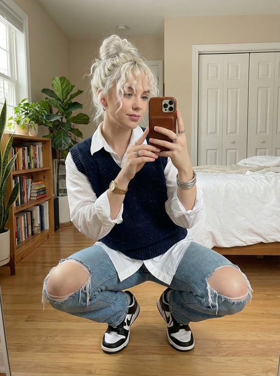 A prompt for generating a surreal video sequence using a handheld smartphone camera perspective with subtle shake. The scene features a young woman who remains completely still and calm while the room rapidly floods with realistic, clear water. The prompt emphasizes high-detail water physics (ripples, bubbles, refraction) and the dramatic contrast between the frozen subject and the chaotic, violent environment.
