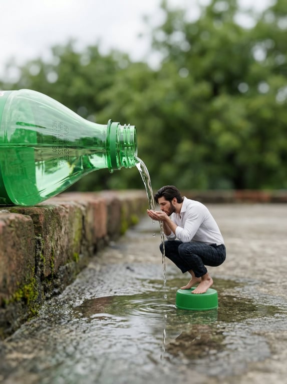A prompt for Nano Banana Pro to generate a surreal, photorealistic scene with extreme scale contrast. It depicts a tiny adult man crouching on a bottle cap, drinking water pouring from the mouth of an enormous green plastic bottle, set outdoors on a wet stone pathway with cinematic depth of field.