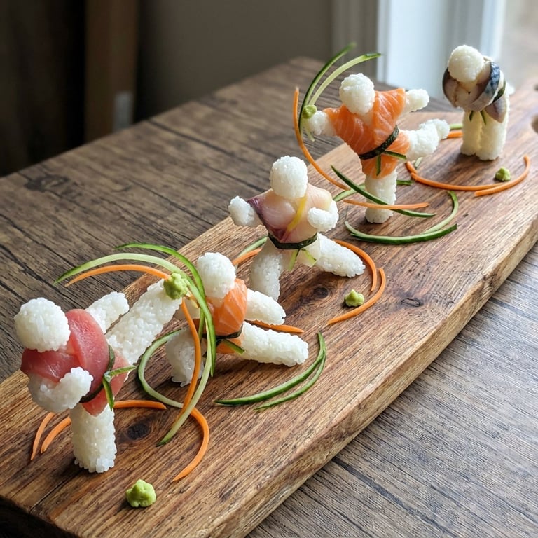 A creative prompt requesting an image of a long wooden board displaying martial arts movements (kata/forms) represented by arrangements of sushi pieces. The arrangement should show flow, garnishes should indicate energy direction, and wasabi should mark power points.