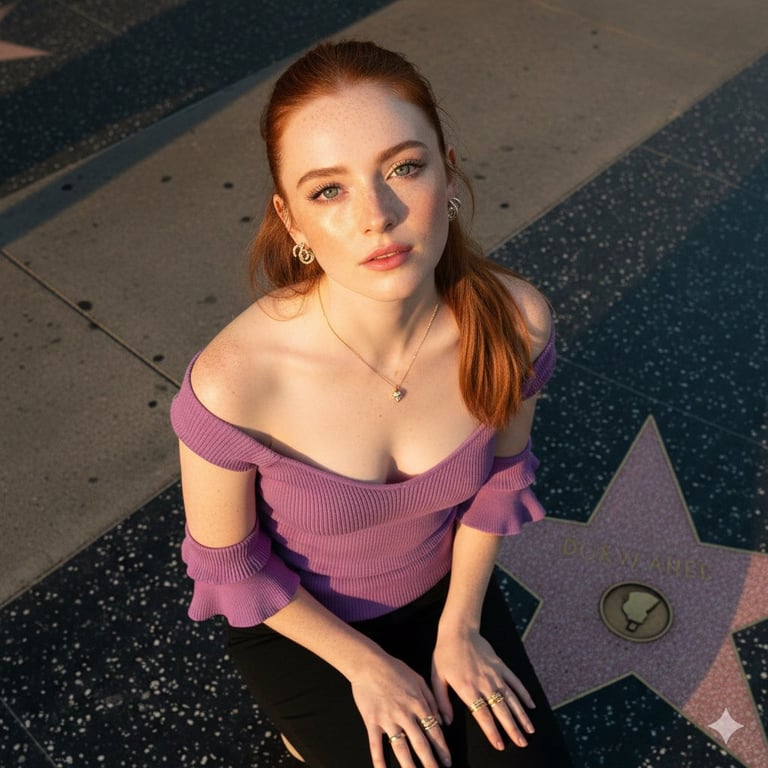 A highly structured JSON prompt for generating an intimate, high-angle portrait of Sydney Sweeney on the Hollywood Walk of Fame during golden hour. It specifies her pose, attire, natural freckles, and the social media aesthetic, while using negative prompts to ensure a natural, candid feel.