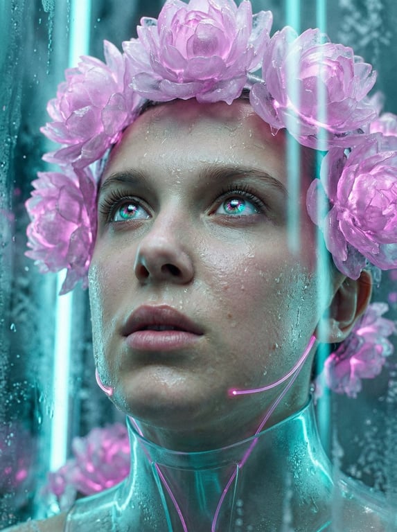 A highly detailed, complex prompt for generating a hyper-realistic, extreme close-up portrait with a cinematic sci-fi aesthetic. The subject, 'The Visionary,' is depicted in a Cryogenic Floral Archive, with natural hair replaced by a glowing halo of frozen, crystalline peonies, emphasizing texture fidelity, specific lighting effects (cyan and magenta), and high-end macro photography settings.
