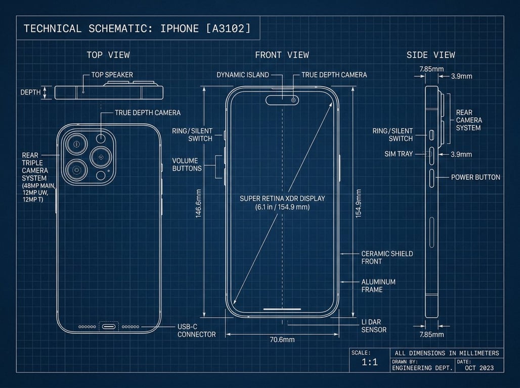 A detailed prompt for generating a technical blueprint drawing of an iPhone, utilizing orthographic views, precise measurements, and a deep blue background, inspired by an engineering schematic style.