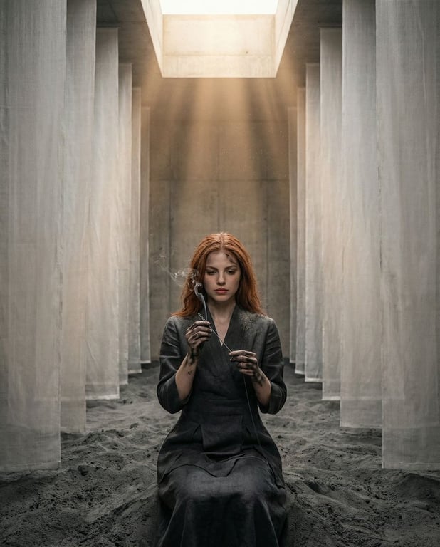 A highly detailed, structured prompt for generating a hyper-realistic, symmetrical image of a melancholic protagonist in a brutalist concrete chamber, focusing on texture, surreal elements like liquid smoke threading a needle, and dramatic, dusty lighting.