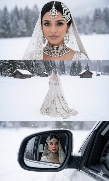 A descriptive prompt for a three-panel vertical portrait collage featuring a South Asian bride in a lavish white bridal lehenga and intricate jewelry. The scene is a serene, snow-covered landscape, with each panel showing a different perspective: a close-up headshot, a full-body back shot, and a reflection in a car's side mirror, all requiring strict face reference maintenance.