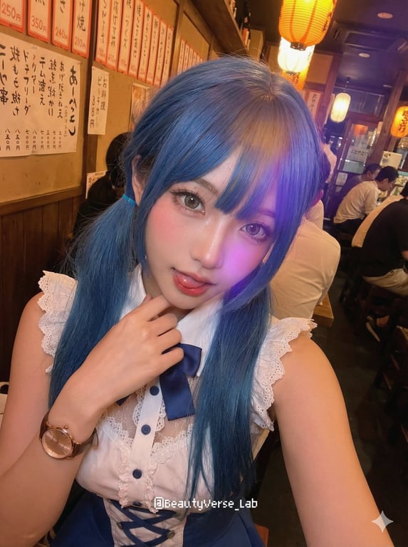A complex, structured JSON prompt designed to generate a close-up, high-angle selfie portrait with a 'tipsy' or 'seductive' vibe, featuring intense pink blush and moody lighting. The prompt uses strict reference priority settings to lock the character's face, outfit, and identity to a provided reference image, ensuring high consistency while applying the specified style and expression (sultry eyes, playful tongue out).