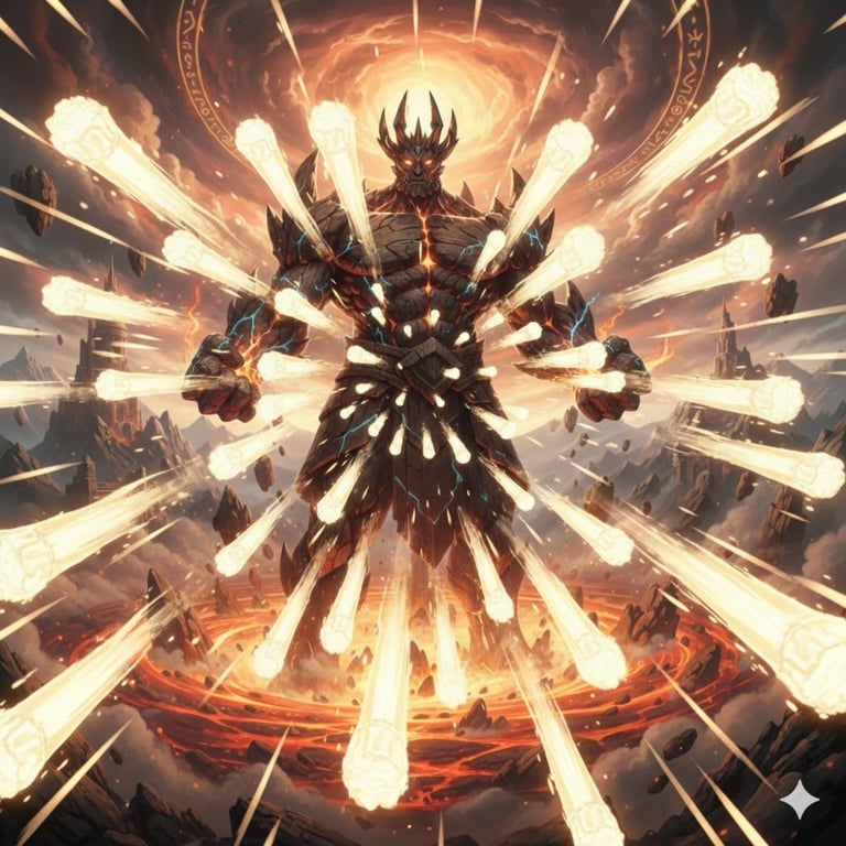 A prompt requesting a depiction of the Final Fantasy summon Titan, positioned slightly smaller and further back in the frame, while emitting a 'Hokuto Hyakuretsu Ken' (Fist of the North Star Hundred Crack Fist) style radiation.