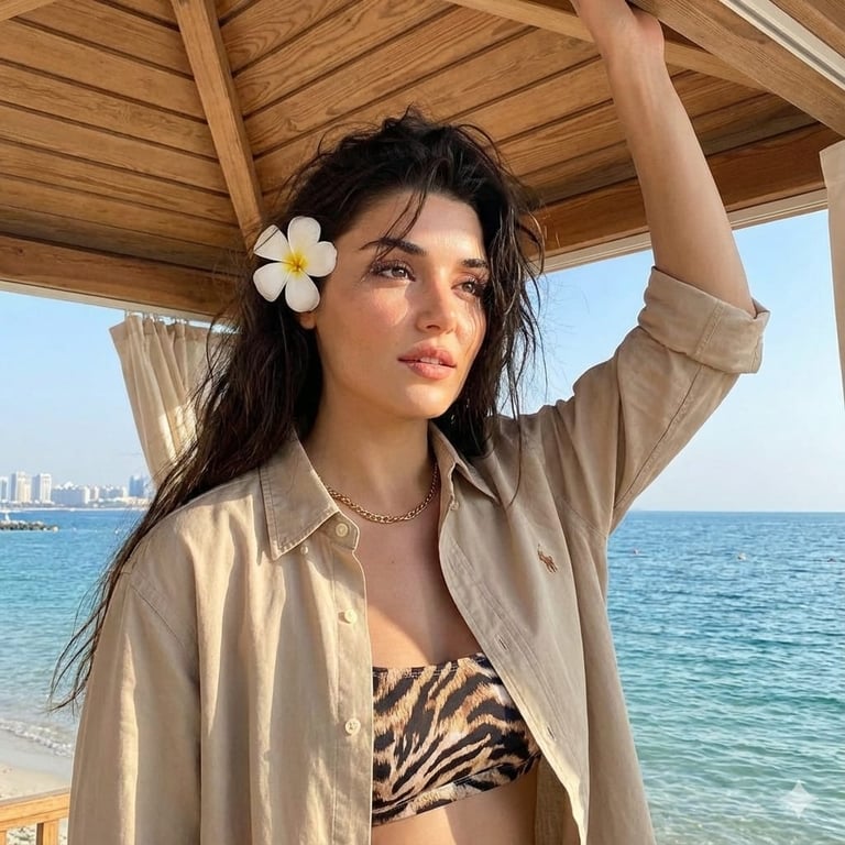 A JSON prompt for Gemini Nano Banana Pro to generate a natural outdoor portrait. It mandates preserving the subject's exact facial identity from a reference image, posing them with one arm raised, and featuring a large white plumeria flower tucked behind the ear, set in bright natural sunlight.