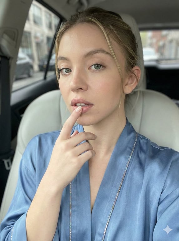 A highly detailed prompt for generating an ultra-photorealistic, intimate close-up portrait in the style of a high-end smartphone selfie taken inside a modern car. It specifies the subject's pose (finger resting on lower lip), attire (satin-finish robe-style top), lighting (soft natural daylight from the side window, zero harsh shadows), and technical details (very shallow depth of field, DSLR-level skin detail) to achieve a clean, dreamy, and candid aesthetic.