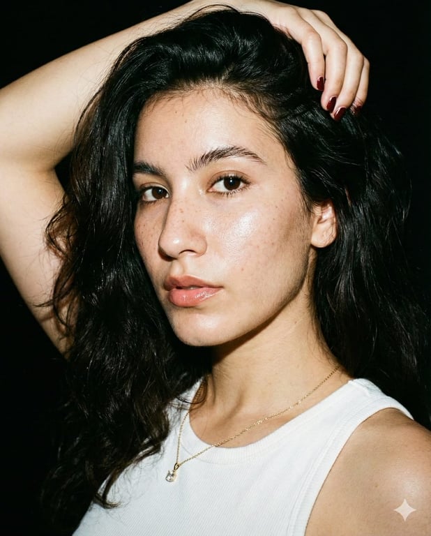 A highly detailed image generation prompt for Nano Banana Pro, designed to create an ultra-photorealistic portrait of a young woman with specific physical attributes, clothing, lighting, and a candid, seductive nightlife energy, mimicking a paparazzi flash photo style.