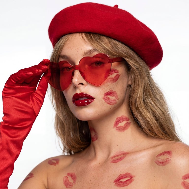A highly specific prompt for generating an ultra-realistic beauty fashion editorial photograph, requiring the model's identity and features to match an uploaded reference image, featuring dramatic makeup and realistic red lipstick kiss marks stamped across the face and chest.