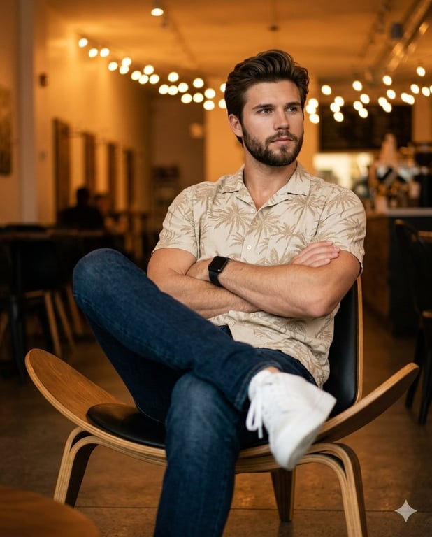A detailed prompt for Google Gemini Nano Banana 2, instructing the generation of an ultra-realistic, full-body portrait of a young man seated in a cozy café. The prompt specifies pose, clothing, warm ambient lighting with bokeh, 50mm lens perspective, and high-resolution realism while preserving the identity from a reference image.