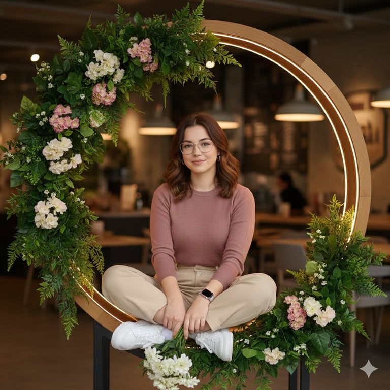 A highly detailed prompt for generating an ultra-realistic, high-end lifestyle portrait of a single subject in a modern café setting. It emphasizes strict identity preservation from an uploaded face image, specific wardrobe details (soft pastel knit top, beige trousers), and precise technical specifications for lighting, camera angle, and composition to achieve pure photorealism without any stylization.