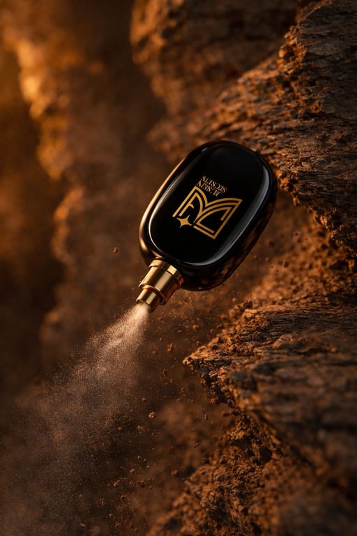 A prompt for generating an ultra-realistic 8K cinematic product photograph of a glossy black perfume bottle falling mid-air beside rugged rock formations, emphasizing motion, dramatic amber lighting, and a luxury fragrance advertisement style.