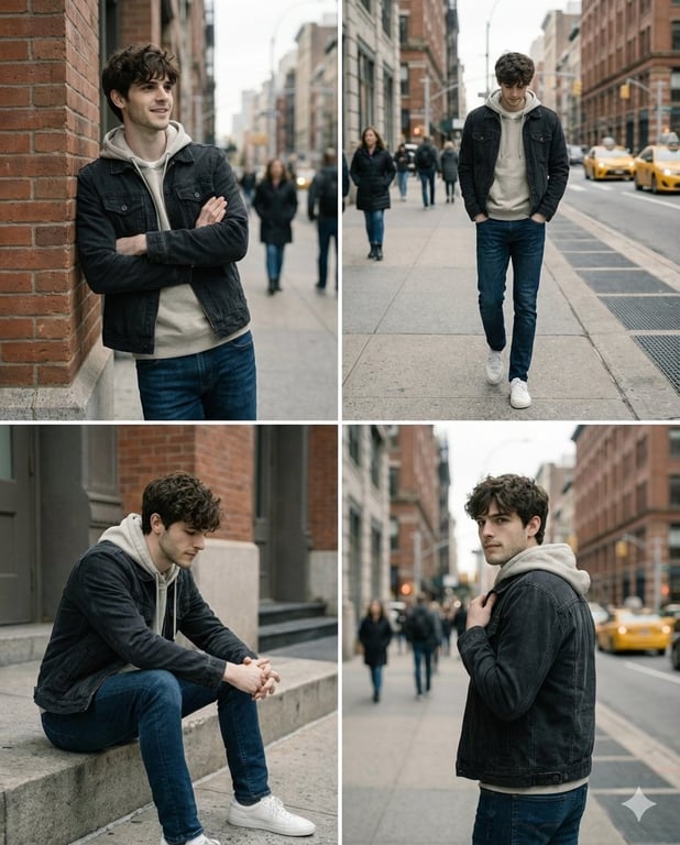 A highly technical prompt designed to generate an ultra-realistic, high-quality portrait of a young man in an urban setting, focusing heavily on authentic skin texture, natural lighting, and professional photography specifications (50mm lens, f/1.8, cinematic depth of field).