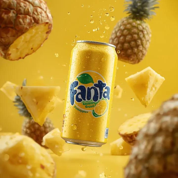 A detailed, structured prompt for generating ultra-realistic, high-end commercial product photography of a floating, matte yellow aluminum soda can (FANTA pineapple flavor), emphasizing dense condensation, floating fruit elements, and vibrant tropical freshness against a seamless solid yellow background.