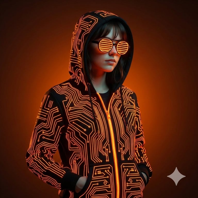 A prompt for generating an ultra-realistic cinematic studio portrait of a person wearing a black cyberpunk hoodie covered in glowing neon-orange circuit lines, emphasizing dramatic lighting and a specific pose.