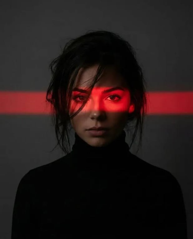 A prompt for Nano Banana Pro requesting an ultra-realistic, moody, and minimalist cinematic portrait. The key feature is a bright, sharp horizontal red light that highlights only the eyes against a deep shadow background.