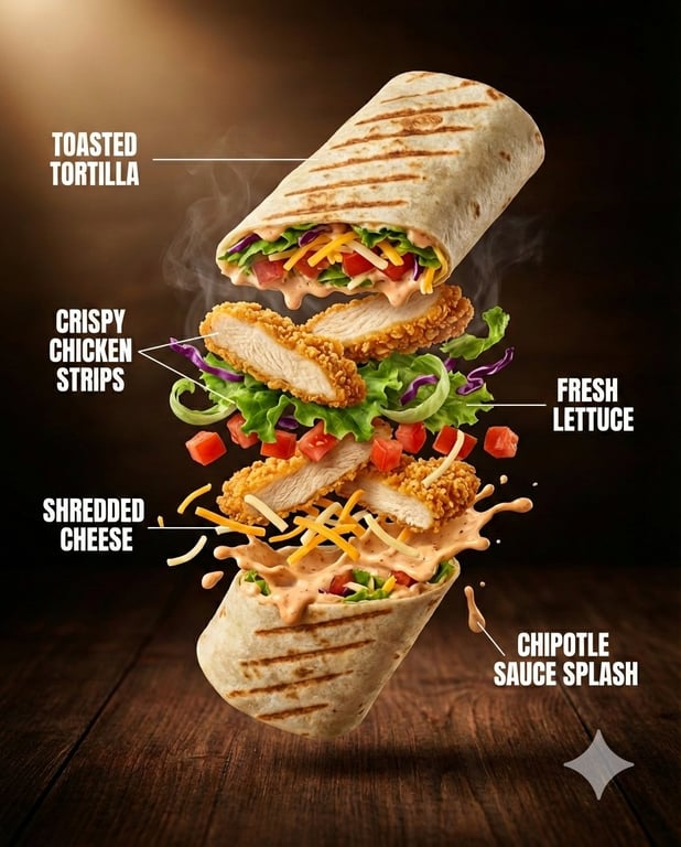 A detailed prompt for generating an ultra-realistic, high-contrast, macro DSLR shot of luxury fast food, designed for vertical advertising with a dramatic exploded composition and cinematic lighting.