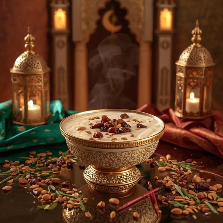 A detailed prompt for Gemini Nano Banana Pro to generate ultra-realistic luxury food photography of a traditional Sheer Khurma dessert, emphasizing rich textures, festive Middle Eastern decor, warm ambient lighting, and a high-end advertising aesthetic.