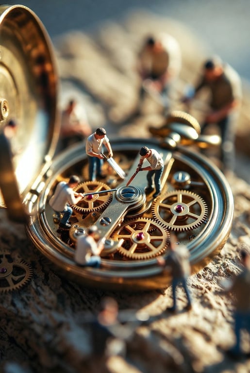 A detailed image generation prompt for an ultra-realistic macro photograph depicting tiny restoration workers collaboratively repairing an antique pocket watch. The scene emphasizes craftsmanship, teamwork, and uses soft, warm directional lighting with shallow depth of field to create an emotional and cinematic mood.
