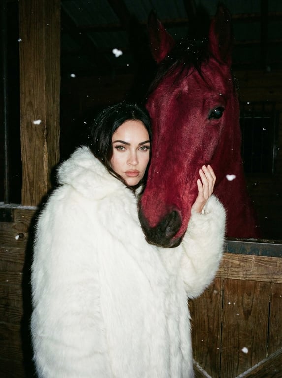 A highly detailed prompt for Nano Banana 2 Pro to generate an ultra-realistic nighttime photograph using direct flash, featuring a woman in a voluminous white fur coat and a deep red horse inside a wooden stable, emphasizing raw realism and contrast.