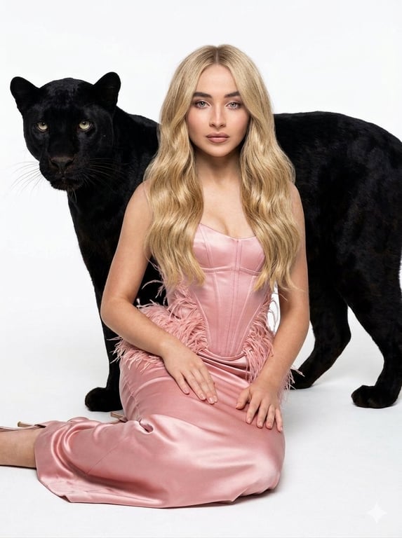 A detailed prompt for Nano Banana 2 to generate an ultra-realistic, luxury editorial portrait of a young woman (using reference identity) sitting in a clean white studio with a black panther behind her, wearing a soft pink satin corset dress, emphasizing strict identity preservation and high contrast lighting.