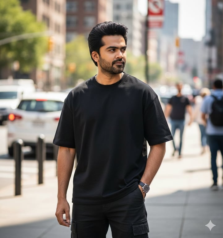 A prompt for an ultra-realistic street portrait of a young man, requiring 100% facial identity accuracy from an uploaded image, specifying attire (oversized black t-shirt, cargo pants), pose, and technical details like shallow depth of field and cinematic color grading.