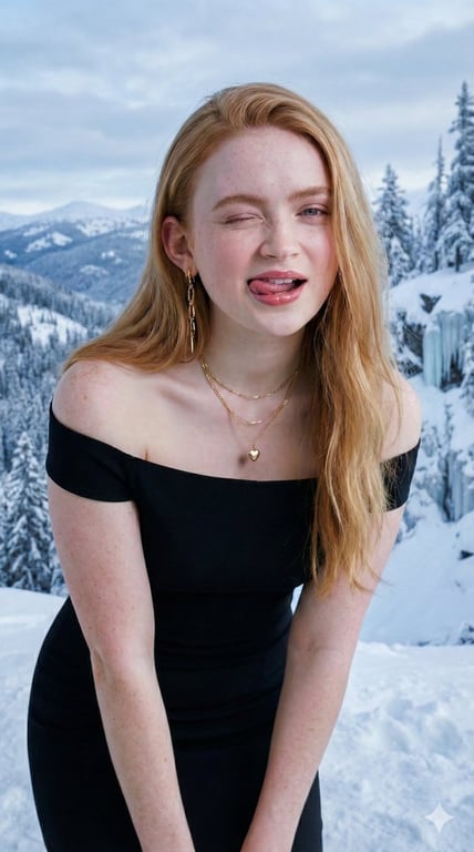 A prompt for generating an ultra-realistic studio portrait of a young woman with a playful, flirty expression (wink and tongue out). It specifies high-fashion styling (blonde hair, black dress, layered gold jewelry) and technical details like a 50mm lens, shallow depth of field, and soft diffused studio lighting.