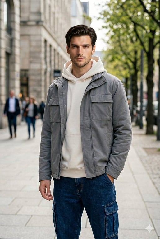 A detailed prompt for generating an ultra-realistic, editorial fashion portrait of a young man in a real outdoor urban environment, emphasizing authentic skin texture, natural daylight, cinematic depth of field, and a candid lifestyle photography feel, aiming for a look taken by a professional photographer, not AI.