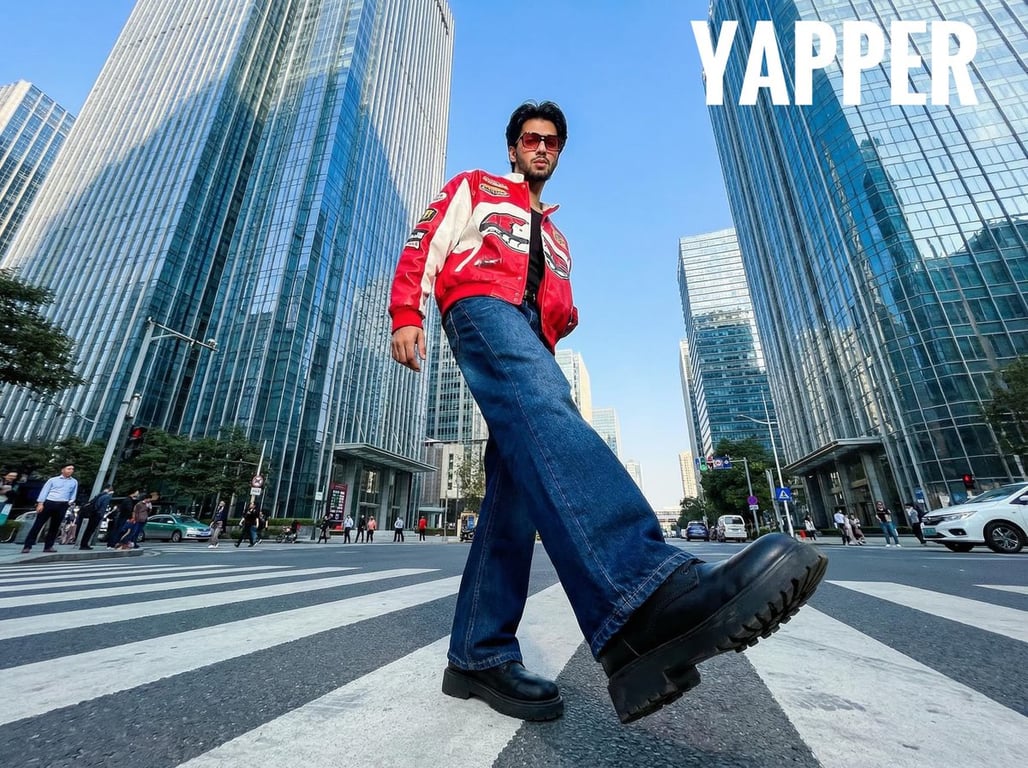 A detailed prompt for Nano Banana Pro to generate an ultra-wide-angle street fashion photograph of a young man crossing a city crosswalk, using a low-angle fisheye lens perspective to create dramatic distortion and Y2K energy.