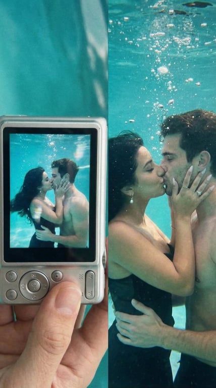 A complex JSON prompt for generating a 2x1 side-by-side diptych featuring an underwater kiss. The left panel shows a hand holding a digital camera displaying the kiss on its LCD screen, and the right panel shows the full, lo-fi underwater photo, emphasizing identity preservation and a nostalgic digicam aesthetic.