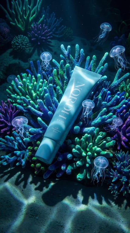 An ultra-realistic prompt for generating a macro product advertisement for a matte turquoise lip treatment tube, placed underwater among bioluminescent coral reefs, emphasizing physically accurate light refraction, god rays, and luxury commercial style.