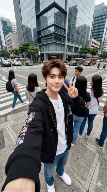 A detailed prompt for generating an ultra-high resolution, wide-angle outdoor group selfie of a young man (based on a reference image) making a peace sign in a busy city intersection, emphasizing hyper-detailed textures, streetwear fashion, and candid smartphone photography style.