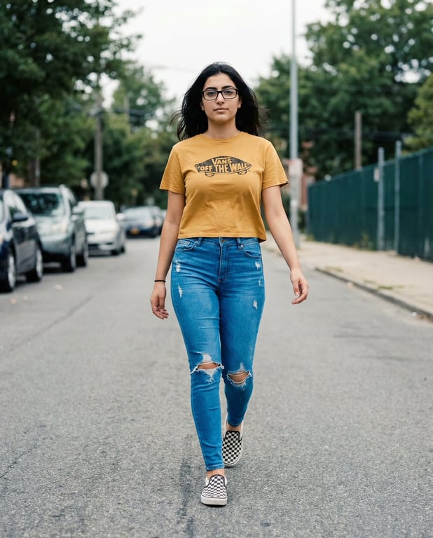 A complex JSON prompt focused on replicating a specific walking pose and outfit from a reference image, while critically ensuring the accurate and realistic integration of a clear, authentic Vans logo onto the subject's cropped mustard-yellow tee. It specifies a hyper-realistic, matte-filmic aesthetic with muted color grading (Kodak Vision3/CineStill inspired) in an urban street setting.