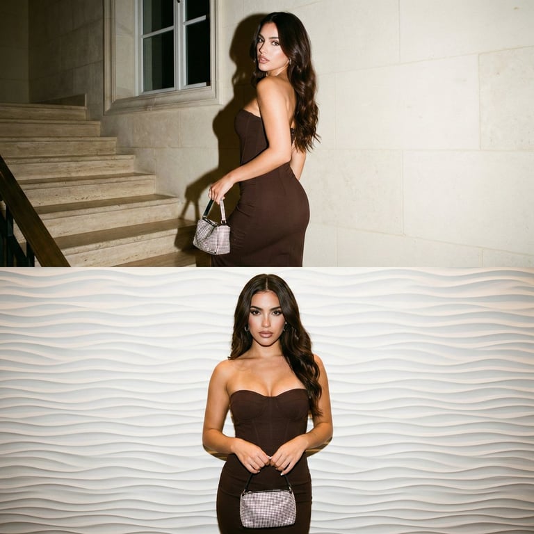 A highly structured prompt for generating a vertical diptych collage (split screen) featuring the exact same woman in both frames, maintaining facial identity and outfit consistency. The aesthetic is ultra-photorealistic, raw candid, and luxury influencer style, captured using paparazzi flash photography in two different compositions and lighting setups.