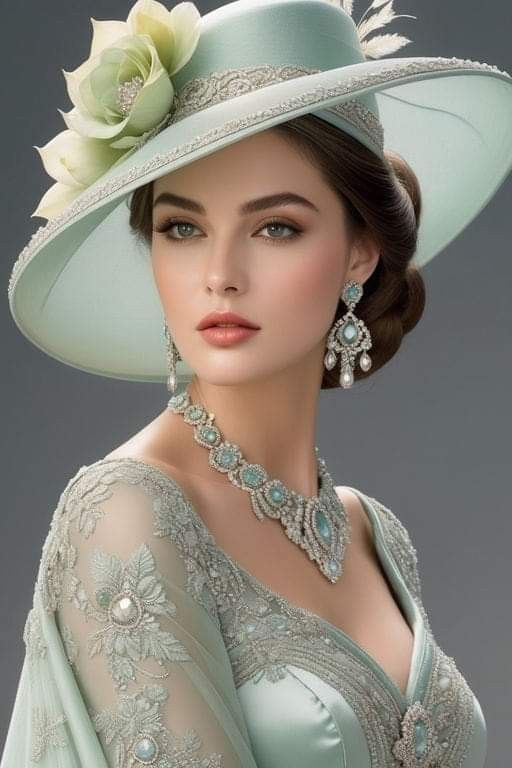 A prompt for generating an ultra-realistic cinematic portrait of an elegant aristocratic woman in a mint-green silk gown, blending Victorian and Edwardian fashion. It specifies intricate details like lace embroidery, diamond jewelry, soft diffused lighting, and an 85mm lens look, aiming for a timeless, high-texture, Vogue magazine editorial style.