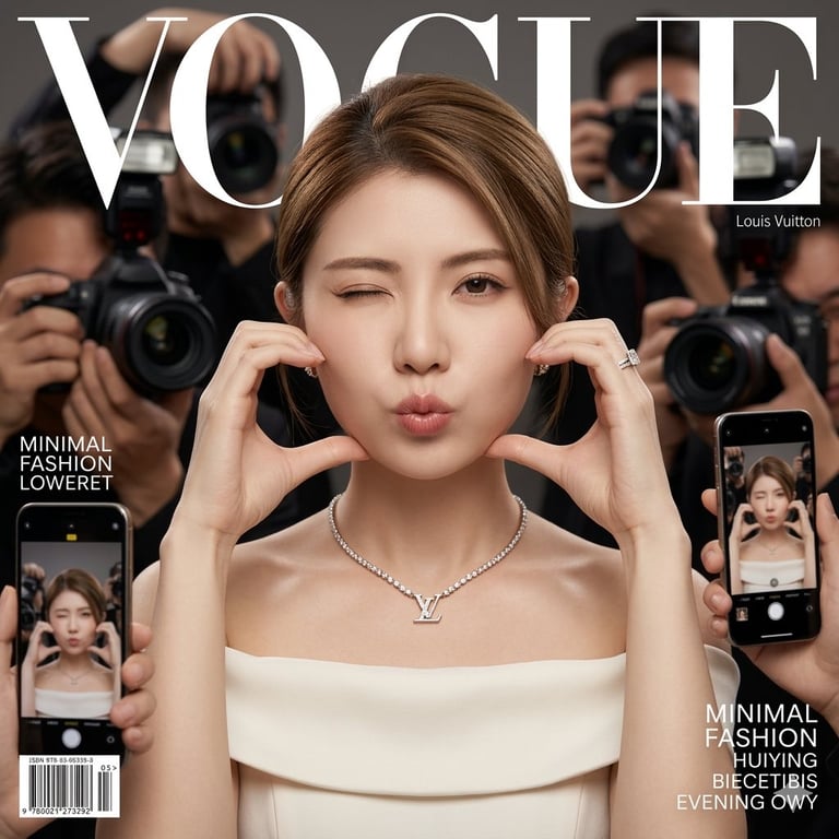 A detailed, structured image generation prompt for Nano Banana 2, designed to create a realistic Vogue magazine cover-style fashion portrait of a young woman. It requires using an uploaded face reference for 100% feature retention, depicting the subject winking and making a heart gesture, surrounded by cameras, emphasizing high-fashion styling, professional studio lighting, and 8K resolution.