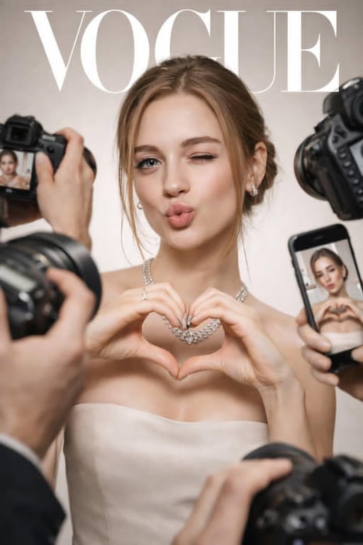 A prompt for generating a photorealistic Vogue magazine cover-style fashion portrait, requiring 100% identity preservation from an uploaded face reference. It features an elegant woman winking and making a heart gesture, surrounded by blurred DSLR cameras and smartphones (paparazzi effect), emphasizing professional studio lighting and a playful yet luxurious high-fashion mood.