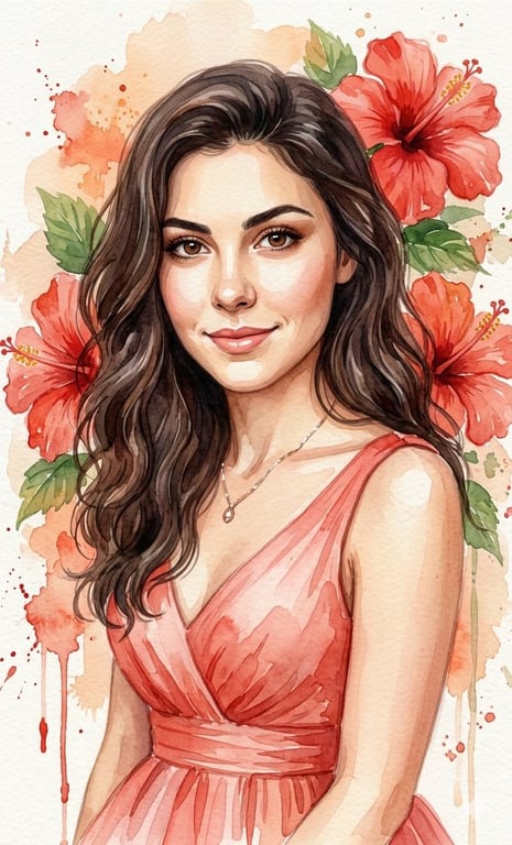 A prompt for generating a soft watercolor portrait of a beautiful woman in a light red ball gown, with her face and pose matching an uploaded photo, set against a background of large red hibiscus flowers.