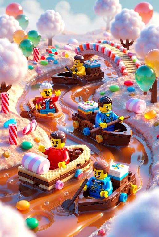 A structured JSON prompt for Google Gemini Nano Banana Pro 3.0 to generate a playful, cartoonish 3D scene of a whimsical candy-themed world, featuring a river of melted caramel and chocolate, and Lego characters in wafer boats.