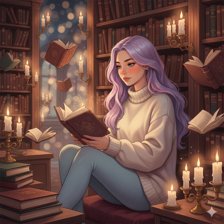 A prompt for generating an ultra-detailed digital painting in a whimsical fantasy aesthetic. It depicts a female subject with lavender hair, sitting at a wooden desk in a cozy library filled with floating, glowing books and candlelight, aiming for a soft, magical, and cinematic glow.